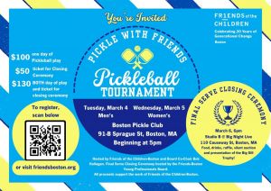 The Final Serve Closing Celebration, hosted by the Friends of the Children-Boston's Young Professionals Board, is open to both pickleball players and the general public.