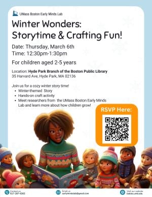 The UMass Boston Early Minds Lab presents Winter Wonders Storytime and Crafts at the Hyde Park Boston Public Library.We'll be reading a fun winter book and making crafts inspired by the story. Afterward, stick around and learn more about how we are exploring how children learn and grow!