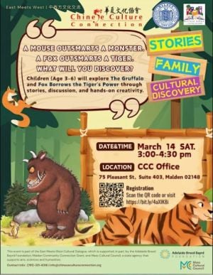 Join us for a special East-meets-West storytime featuring The Gruffalo and the classic Chinese fable “The Fox Borrowing the Tiger’s Might,” plus a fun craft activity exploring courage & wisdom!