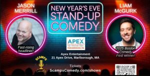 Top Boston Comedians Jason Merrill and 2025 Boston Comedy Festival Winner Liam McGurk co-headline the end-of-year event at Apex Entertainment Marlborough on Wednesday, December 31.