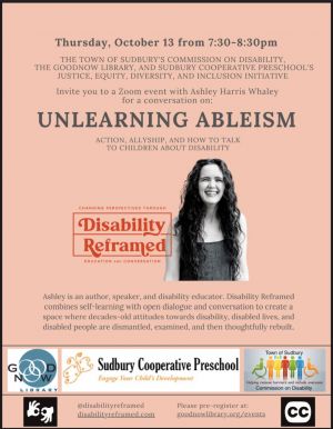 The Town of Sudbury’s Commission on Disability, the Goodnow Library, and Sudbury Cooperative Preschool’s Justice, Equity, Diversity, and Inclusion initiative invite you to a Zoom event with Ashley Harris Whaley from Disability Reframed for a conversation on “Unlearning Ableism: Action, Allyship, and How to Talk to Children about Disability'.It is a wonderful opportunity for parents/guardians, grandparents, educators and allies of the disability community to come together to learn and ask questions.