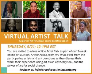 You are invited to join Creative Action Institute for a special virtual event as we hear from our partner artists representing over eight countries.During the Artist Talk, each artist will discuss their work, their use of art in creative advocacy projects, the power of art for social change, and answer questions from the audience.