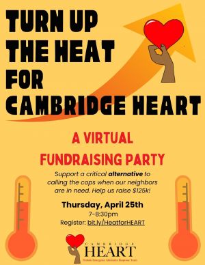 Turn up the heat for HEART at our annual virtual fundraiser on Thursday, April 25th from 7-8:30pm!Cambridge Holistic Emergency Alternative Response Team (Cambridge HEART) is a community-led proactive public safety program that aims to address the immediate needs of people in conflict or crisis (at the moment of crisis).