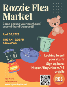 The Rozzie Flea Market at Adams Park is a fun opportunity to gather in our neighborhood, to meet our neighbors, and to clear a few items out of our basements--like a neighborhood yard sale. Join us Sunday, April 30, from 11-2pm, to shop for second-hand treasures at Adams Park. You never know what you might find!