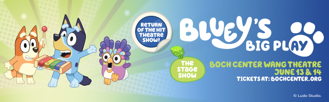 Tickets are on sale now for Bluey's Big Play, live at Boch Center Wang Theatre June 13 & 14! Bring the whole family for an original stage show featuring new music, life-size puppets, and the beloved Blue Heeler family.